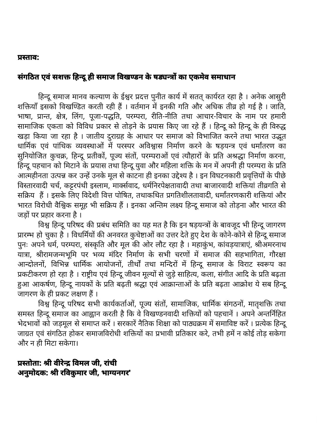 पारित एक प्रस्ताव में कहा गया है कि 'इन विघटनकारी प्रवृत्तियों के पीछे विस्तारवादी चर्च, कट्टरपंथी इस्लाम, मार्क्सवाद, धर्मनिरपेक्षतावादी तथा बाजारवादी शक्तियां तीव्रगति से सक्रिय हैं। इसके लिए विदेशी वित्त पोषित, तथाकथित प्रगतिशीलतावादी, धर्मांतरणकारी शक्तियां और भारत विरोधी वैश्विक समूह भी सक्रिय हैं। इनका अंतिम लक्ष्य हिंदू समाज को तोड़ना और भारत की जड़ों पर प्रहार करना है।' प्रस्ताव में हिंदू समाज से आह्वान करते हुए कहा गया है कि वो 'विखंडनकारी शक्तियों को पहचान कर अपने अंतर्निहित भेदभावों को जड़मूल से समाप्त करें।' इसमें सरकारों से भी 'नैतिक शिक्षा को पाठ्यक्रम में समाविष्ट' करने का आह्वान किया गया है।
